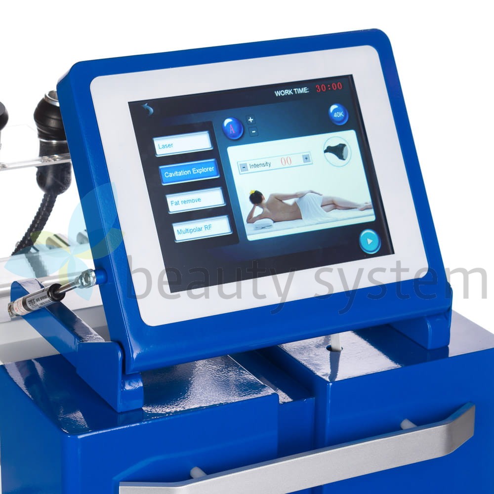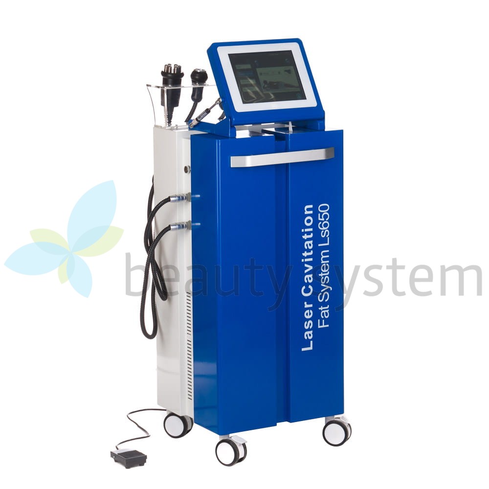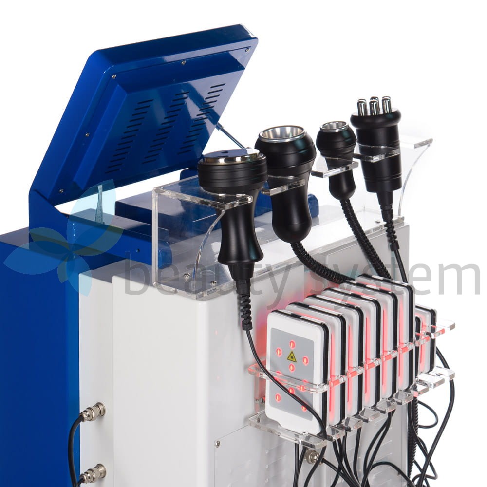 Profesjonalny aparat BeautySystem, BR-059 stworzony do zabiegów wspomagających odchudzanie. Urządzenie wyposażone w 8 padów lipolasera, jedną głowicę do Radio Frequency - Fale radiowe, jedną do Kawitacji Ultradźwiękowej 40kHz oraz dwie do masażu próżniowego - liposukcji.
