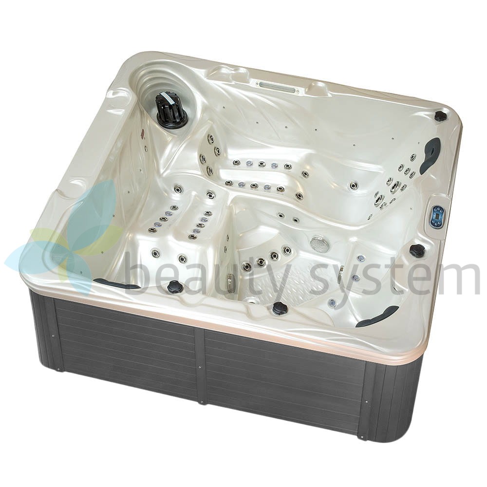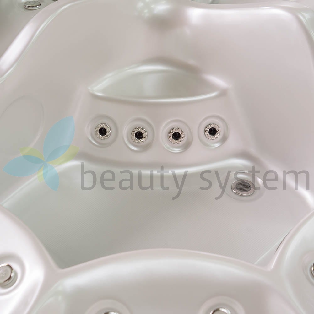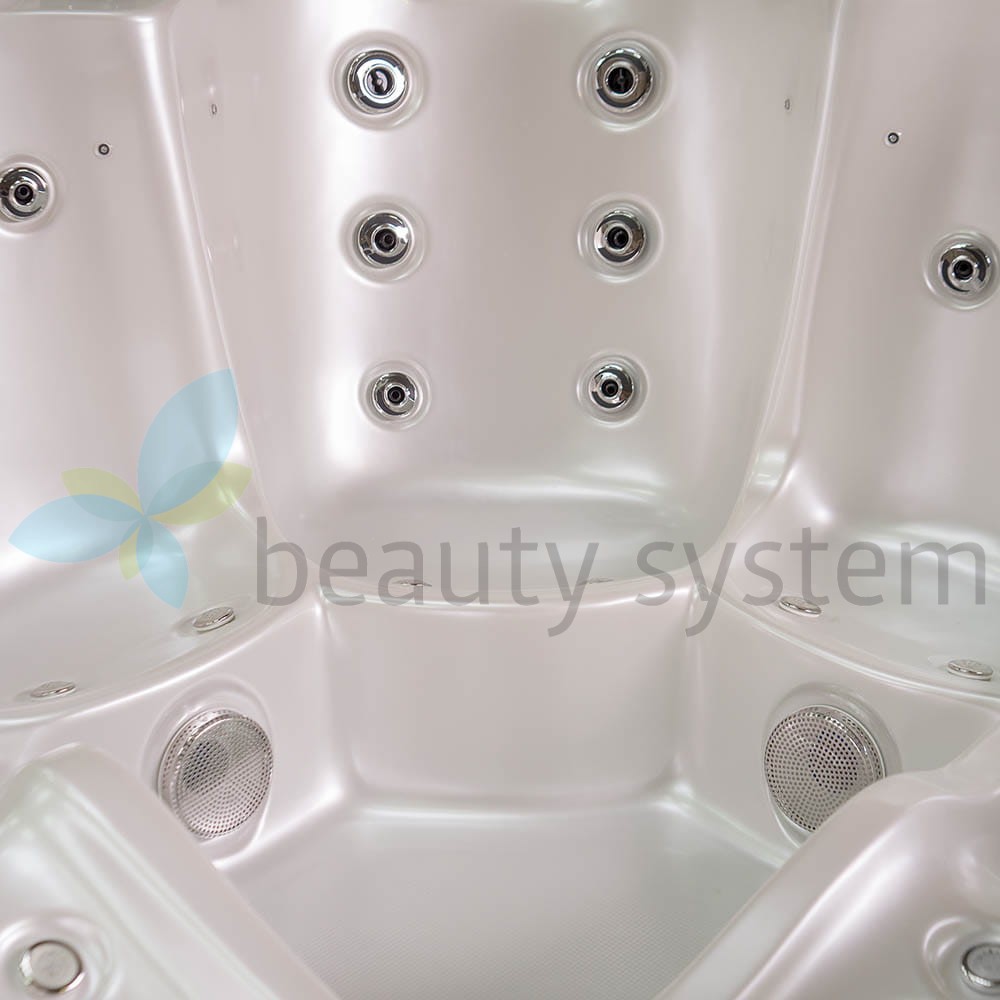 Jacuzzi Madera jest w stanie pomieścić równocześnie aż pięć osób – znajdziesz tu dwie leżanki z wygodnymi zagłówkami z oświetleniem LED, jak również trzy miejsca siedzące. Każde z tych miejsc pełni nieco inne funkcje. Wypoczywając na leżance, możesz rozkoszować się delikatnym hydromasażem pleców, łydek oraz stóp. Na miejscach siedzących ciepłe bąbelki będą masować natomiast Twoje plecy, talię oraz biodra.