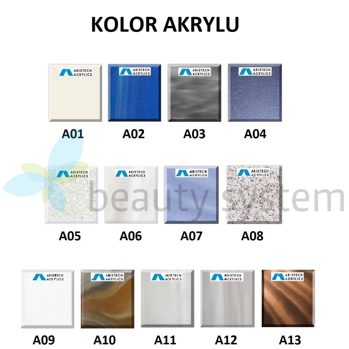 Akryl w kolorze perłowym. Z zewnątrz wanna pokryta jest termoizolacyjną gęstą pianką natryskową o grubosci2,5cm!