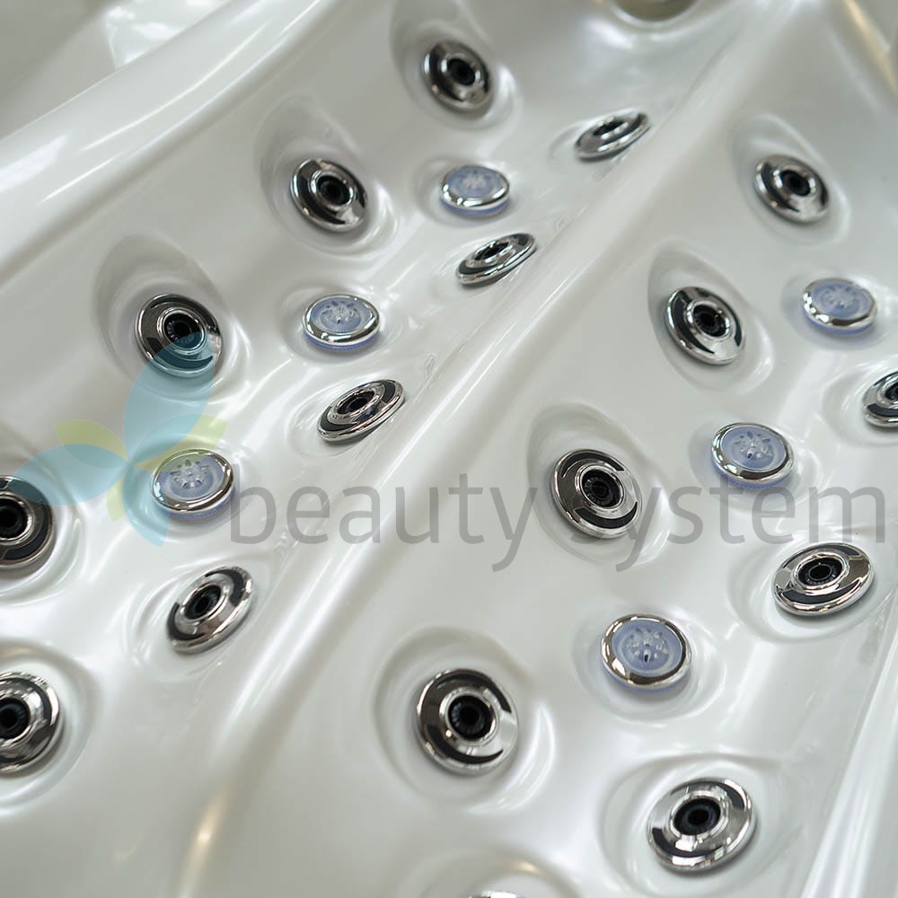 Lubisz to uczucie, gdy podgrzane bąbelki delikatnie masują Twoje ciało? W nowoczesnej wannie ogrodowej Mauritius uczucie to potęguje aż 136 dysz wodno-powietrznych (118 dysz do hydromasażu i 18 dysz powietrznych), zasilanych trzema pompami do hydromasażu, pompą cyrkulacyjną oraz powietrzną. Jeśli zastanawiasz się, na jaką formę masażu możesz liczyć, to odpowiedź jest prosta – każdą, na jakąkolwiek tylko będziesz mieć ochotę! Zajmując miejsce na jednej z dwóch leżanek z oświetlonymi zagłówkami, możesz podziwiać piękno otaczającej Cię natury, a także zapewnić sobie przyjemny masaż pleców, łydek oraz stóp. Do dyspozycji masz również jedno z trzech miejsc siedzących, na których czeka Cię masaż pleców, talii oraz bioder.