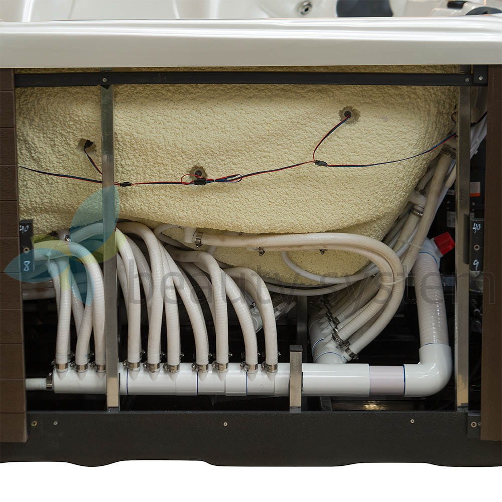 Jednym z najważniejszych atutów wanny ogrodowej Mauritius jest jej niezrównana wytrzymałość i świetna termoizolacja. Podłoga wykonana z grubego tworzywa ABS, a niecka pokryta odpornym na zmienne warunki atmosferyczne akrylem w odcieniu perłowym sprawiają, że nasze jacuzzi zachwycać Cię będzie swą niezawodnością i trwałością przez wiele lat. Co ważne, wnętrze wanny wzmocniono włóknem szklanym, co dodatkowo podwyższa jej wytrzymałość.