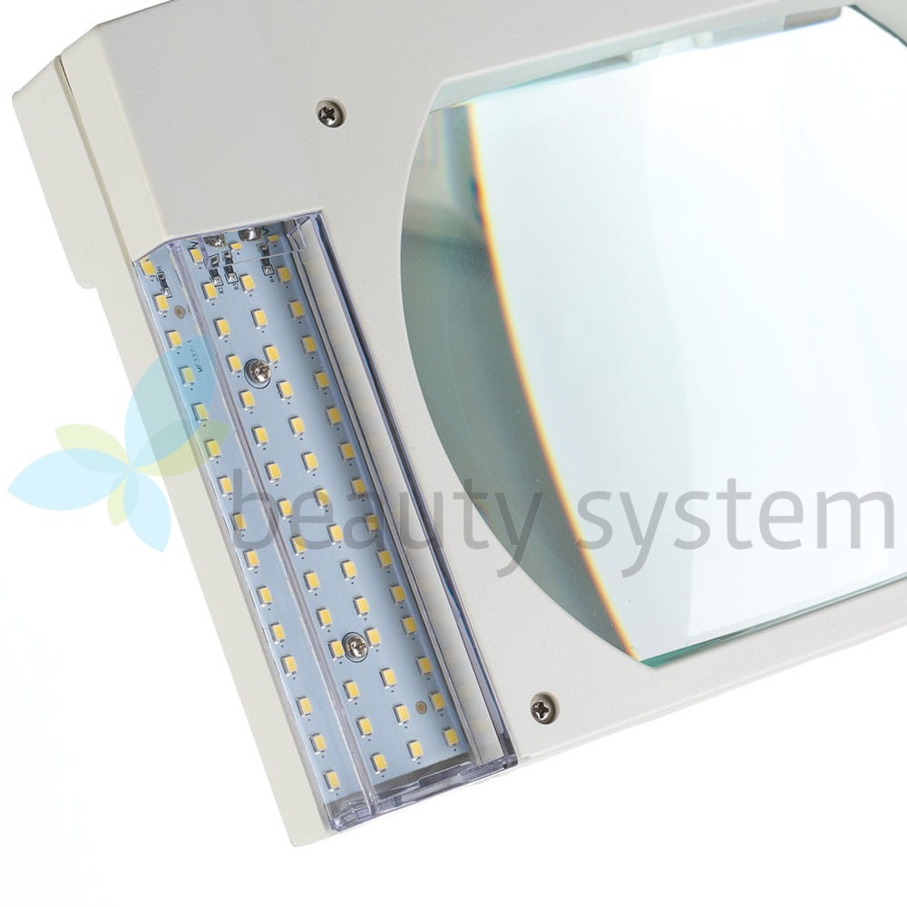 14. Lampa z lupą - łatwa do montażu i ustawienia lampa powiększająca posiada wysokiej jakości refrakcyjne szkło powiększające oraz wbudowany system oświetlający, które umożliwiają perfekcyjne diagnozowanie skóry. Głowica lampy umieszczona jest na wysięgniku, ułatwiającym jej ustawienie na określoną odległość i wysokość. Lampa zapewnia komfort podczas wykonywania zabiegów kosmetycznych.