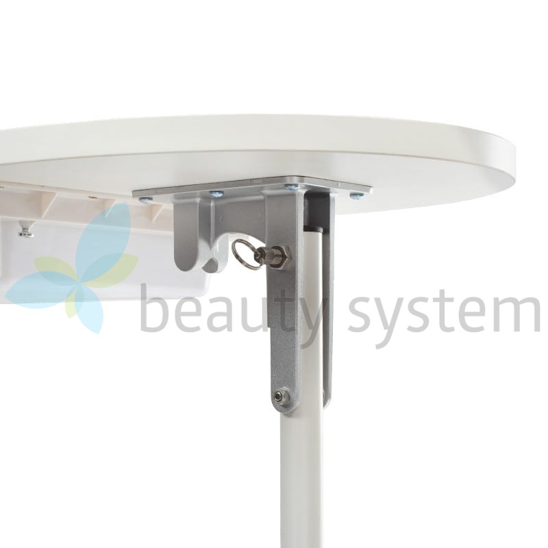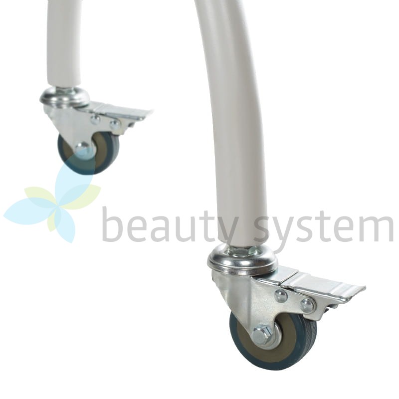 Stolik posiada 4 praktyczne kółka, które ułatwiają przemieszczanie i zapewniają wygodę pracy. Dodatkową zaletą przenośnego stolika jest możliwość jego składania, co pozwala zaoszczędzić przestrzeń, szczególnie ważną w niewielkim pomieszczeniu czy przewożeniu w przypadku mobilnego gabinetu.